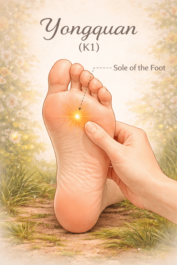 In TCM, Yongquan is associated with the Kidney meridian and is believed to help bring energy downward and stabilize the body.